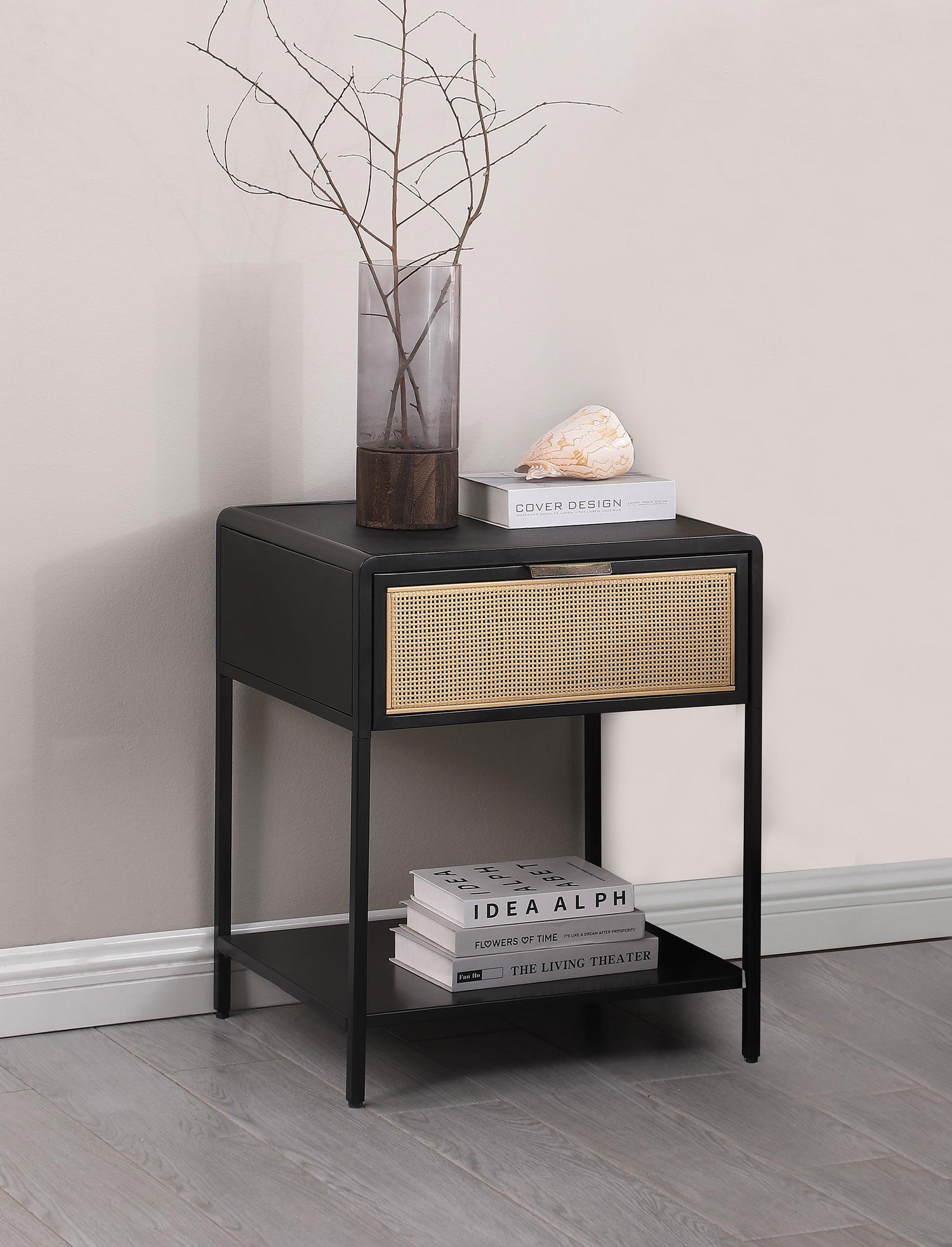 Amherst 1-drawer Radio Weave Cane Metal Bedside Table Black