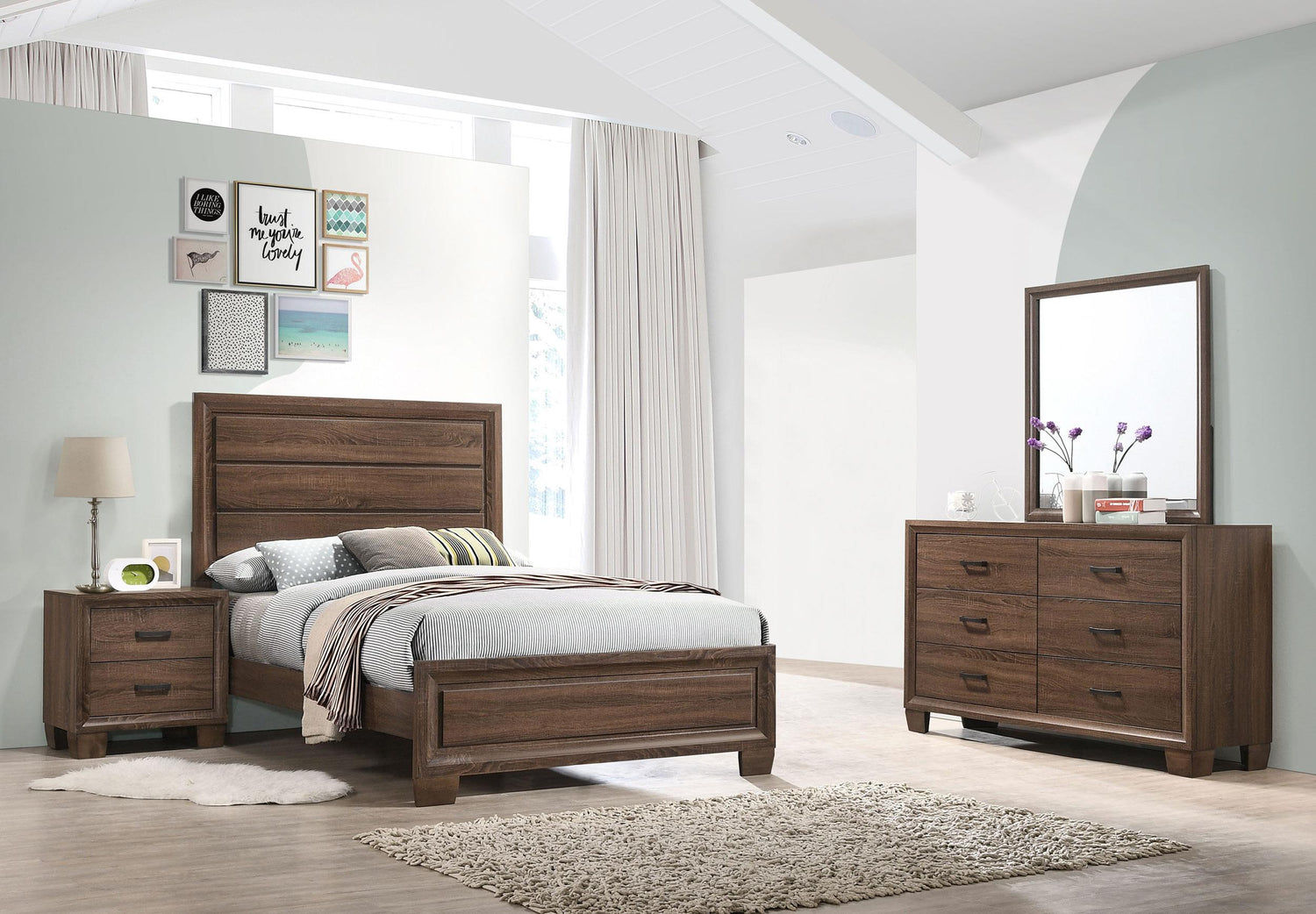 Finished in a lovely, warm brown wood tone, this four-piece bedroom set includes a bed, single nightstand, and a dresser and mirror combo.Clean, minimal lines create a transitional style along with the horizontal paneled headboard.Extra fine details include a felt-lined top drawer, black finished hardware, and Kenlin center drawer glides for smooth and easy access.With tapered block style feet, and molding details on each piece, this set lends a versatile, transitional style that lends a rustic vibe.This bedroom set also offers several bed sizes.