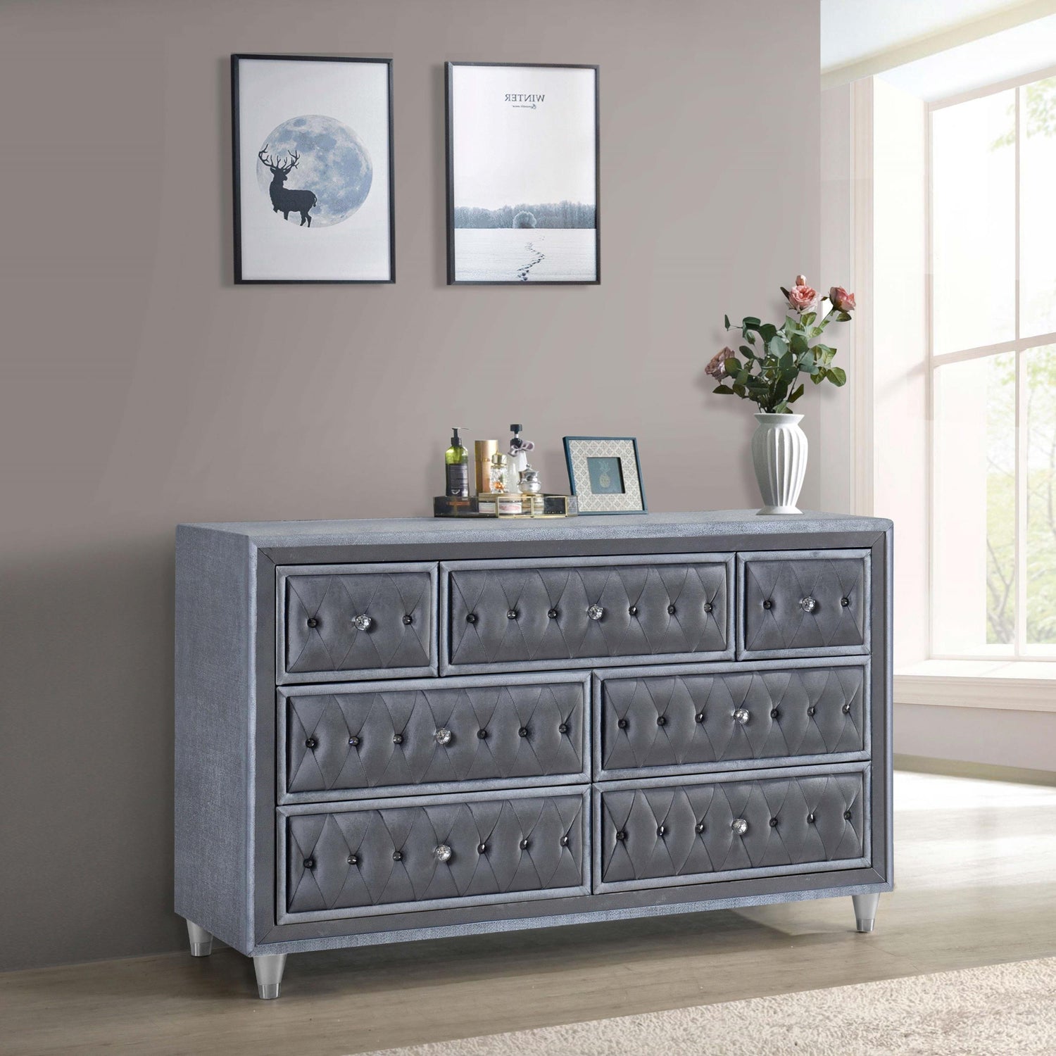 Jeweled knobs and decadently soft upholstery create a regal, almost romantic sensibility for a glam seven-drawer dresser. Ideal for organizing and storing clothing and accessories, four large lower drawers deliver exceptional interior space. On top three smaller drawers includes two perfect for delicates and a center drawer with felt lining to protect your favorite pieces or other accessories. Each drawer front is meticulously crafted, with French front and English back dovetail joinery that delivers the longevity and durability you expect. Drawer fronts are adorned with diamond button tufting, complete with stitching accents, faceted buttons, and crystal-like knobs that add sophisticated elegance.