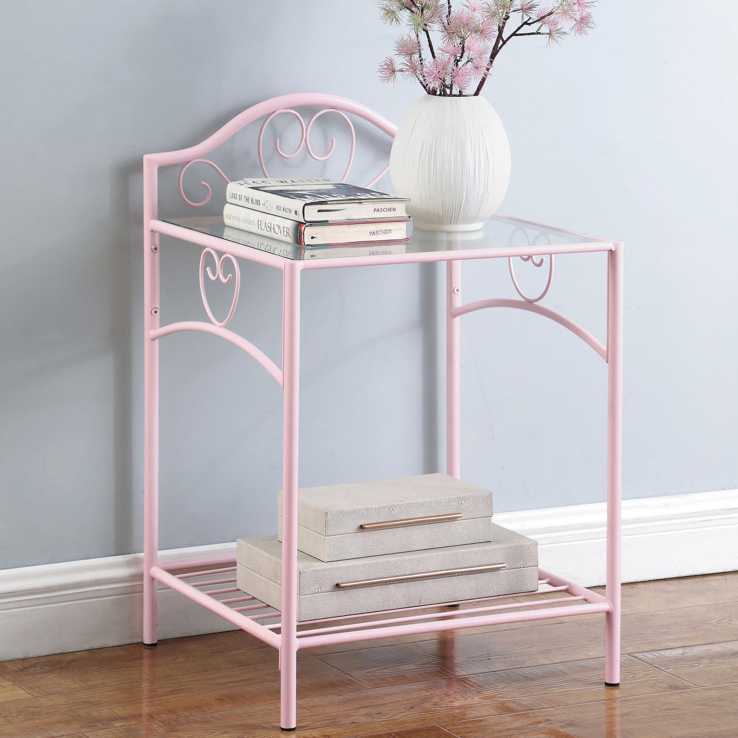 Pretty in pink, this gracefully designed nightstand adds an element of delicate class to a child’s or teen’s bedroom. Enjoy a romantic silhouette combining linear and curved elements with tender, ornate accents. Steel construction offers durability in a nightstand with a powder pink finish. A clear tempered glass top gleams to offer an elegant embellishment. A slower slatted shelf doubles storage options to make this nightstand a contender.