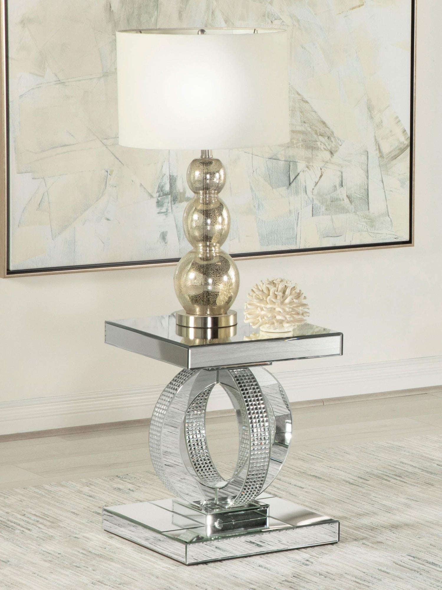 This glamorous end table is a real showstopper. Designed entirely of polished mirror surfaces, this end table creates a dazzling display and furniture piece flanked beside an accent chair. A square top rests on a spherical, interconnected dual rings that lend a Hollywood regency touch. Each ring features a narrow outer edge covered in faceted mirror-like tiles that have a scintillating effect. Each large mirror surface also offers a softly beveled edge that adds to the visual interest and elegance.