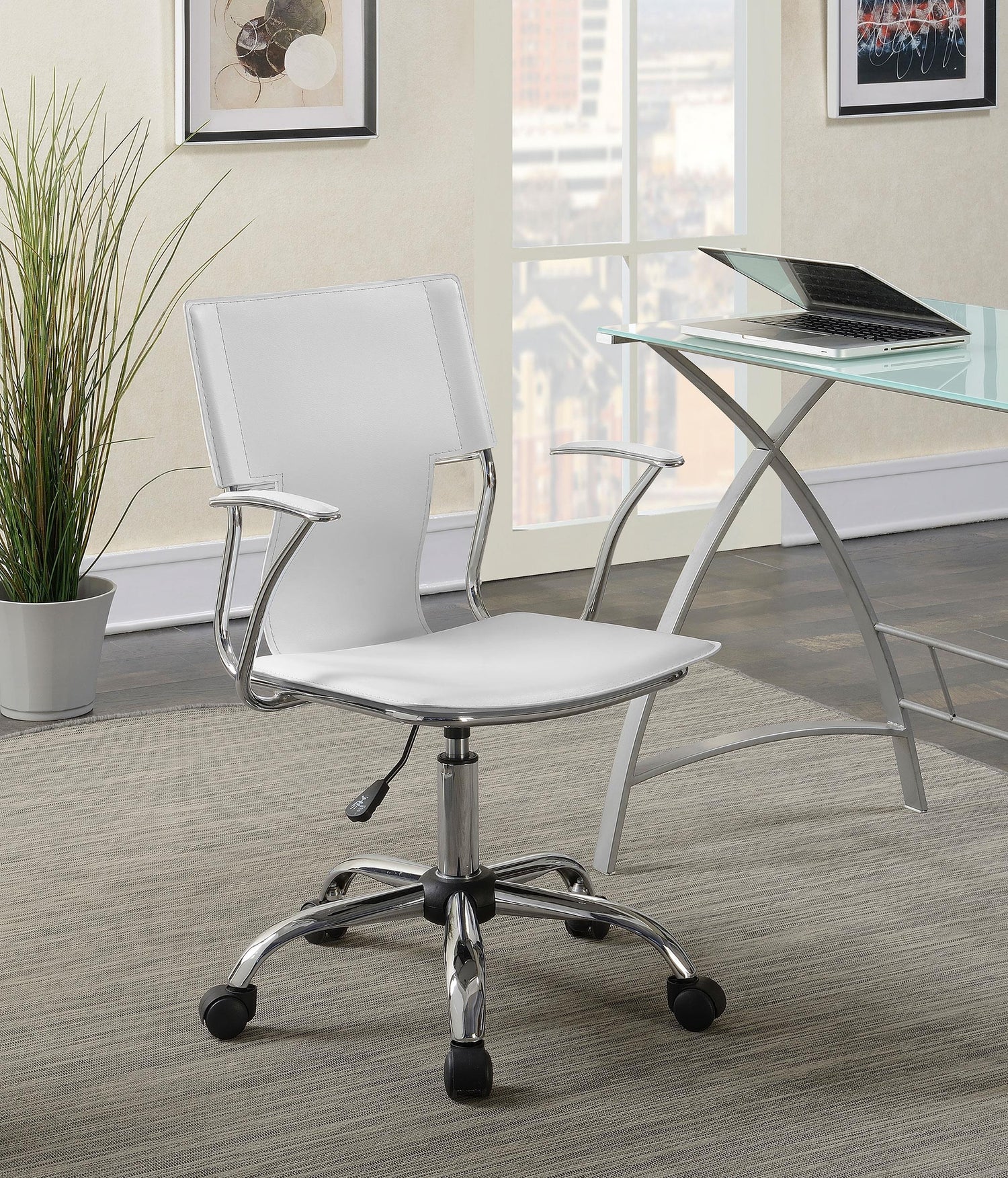 With a sleek, modern design, this office chair is a stylish choice. Its shiny, silvery base and armrests add an appealing hint of polish to its chic silhouette. Built-in casters allow for smooth, versatile ease of movement. A swivel base and height adjustability offer added convenience and comfort. This chair is offered in a variety of colors to instantly update your office decor.