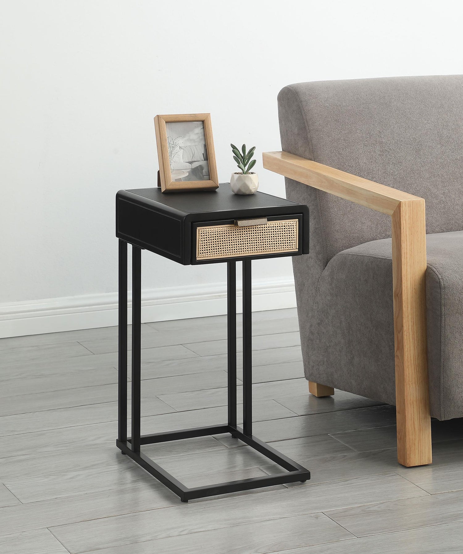This C-shape side table effortlessly combines style and functionality, making it the perfect accent for your living space. Constructed with a sturdy heavy gauge metal frame, it offers lasting durability while maintaining a sleek, modern profile. The single drawer features a polyethylene (PE) rattan front, adding a touch of natural texture and charm. Its C-shape design allows it to slide easily under sofas or chairs, providing convenient surface space where you need it. This side table is both practical and stylish, ideal for any contemporary home.