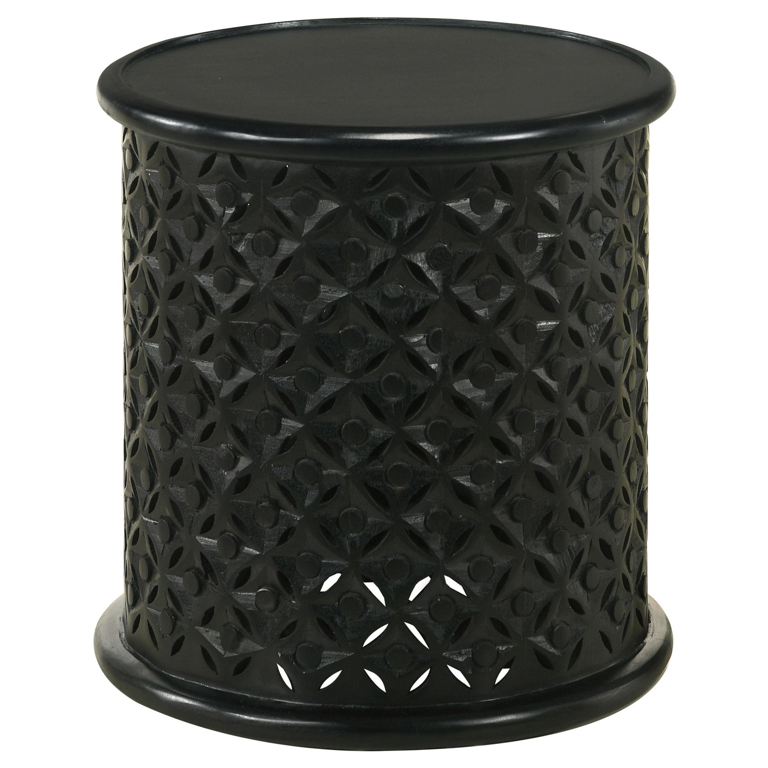 Ornate lattice work is beautifully carved into a striking bohemian accent table. Crafted from 100 percent mango wood, the table is an eco-friendly choice that brings depth and artistry to a welcoming living space. A drum-like silhouette is a perfect choice for ac compact entryway or to add height and detail to your living space. Brimming with texture, the round table lends symmetrical flair with a raised lip that encircles the tabletop and is mirrored at the base of the table. Charming and versatile, this table works in a range of traditional, contemporary and farmhouse living spaces.