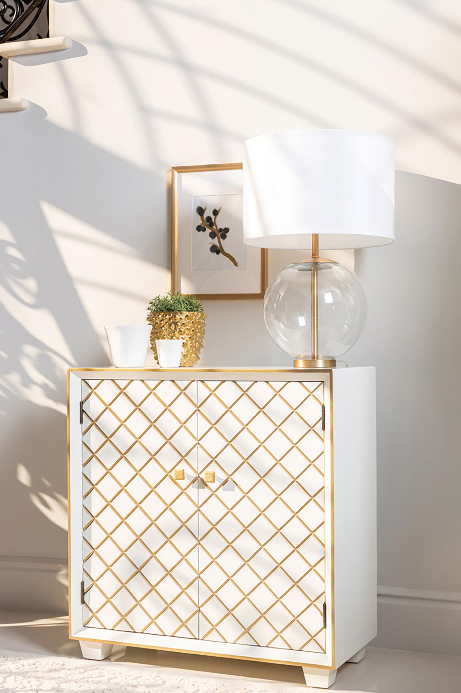 Breathe new life into your decor with this gorgeous, wooden accent cabinet. Elegant tones of white and gold add stylish allure to this piece. The front is adorned with a gold lattice design for a lavish, luxurious look. Gleaming gold hardware rounds out its design in ultra-chic style. This beautiful cabinet is complete with two doors for convenient, concealed storage space.