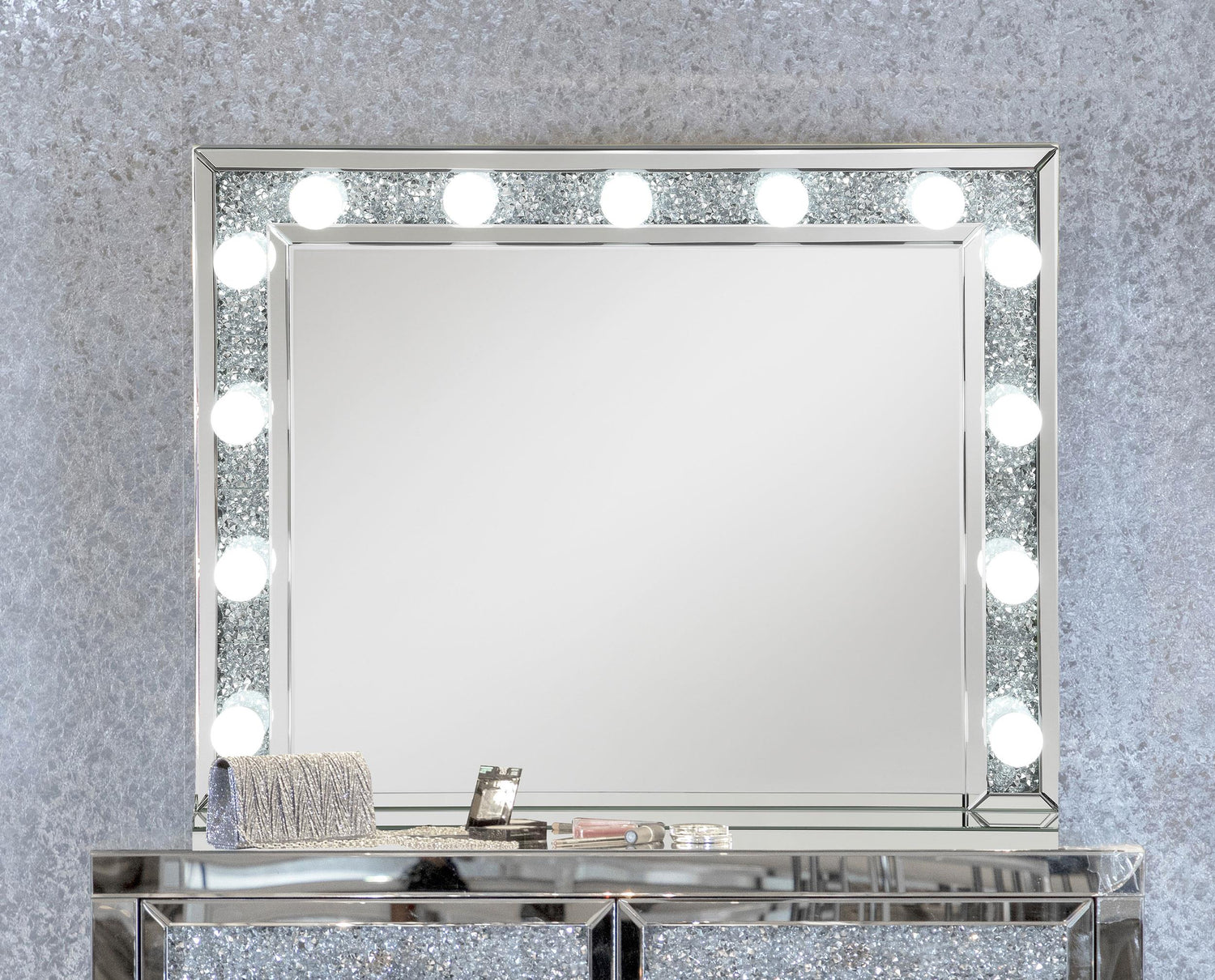 With a Hollywood regency flair, this table mirror is perfectly suited for a vanity tabletop. Place it above a vanity for a place to sit an apply makeup and more. With a rectangular shaped frame, filled with glimmering silver crystals and outlined in mirror paneling, this mirror offers all the luxe glam you need. As practical as it is glamorous, it offers a button switch power cord and over a dozen opaque white globe style bulbs for a retro-inspired look. Place this vanity mirror in a dressing area for a regal flair.